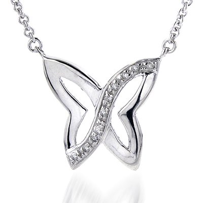 Simple, delicate and feminine. This sterling silver necklace features a white lustre finish with a butterfly design. There are 8 round cut diamonds in four-prong settings. With a lobster claw clasp on the rolo link chain, this necklace measure 17"L.