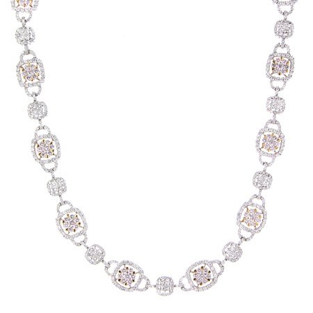 This gorgeous 18k white and rose gold diamond necklace, designed in Italy, contains 98 fancy pink diamonds of exquisite color, weighing 4.69 carats total with 56 princess cut and 757 round brilliant cut white diamonds of F color, VS2 clarity and excellent cut and brilliance weighing 9.51 carats total.