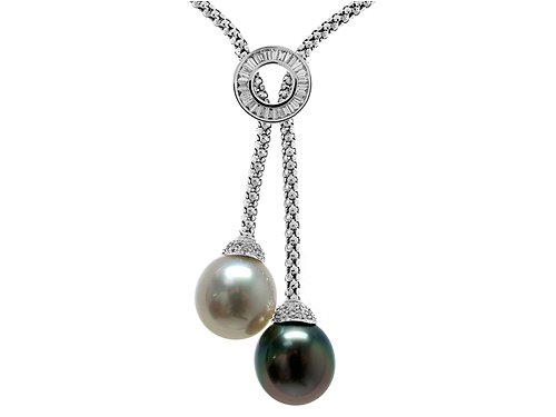 This fashionable 18k white gold necklace has two lustrous 12-13mm South Sea and Tahitian pearls decorated with 49 diamonds, weighing .66 carats. FREE GIFT BAG AND GIFT CARD! Finejewelers Style Number: N005006.