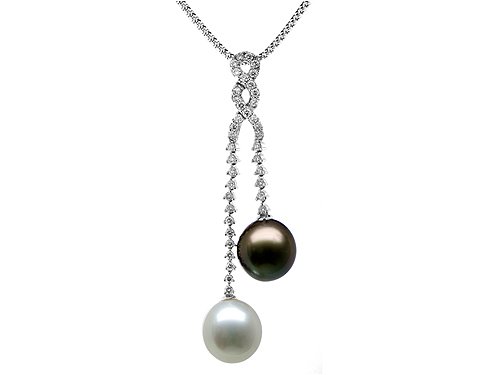 This magnificent pendant features a 14k white gold chain holding two 12-13mm South Sea and Tahitian pearls. It holds 39 diamonds, weighing .71 carats. Free 16 Inches chain included! FREE GIFT BAG AND GIFT CARD! Finejewelers Style Number: P002138.