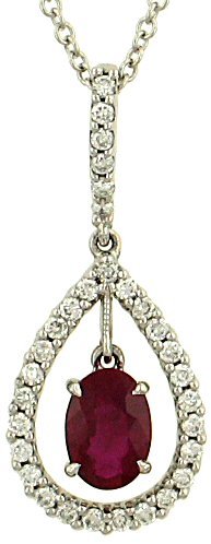 Ladies Pave Diamond Pear Shaped Drop Pendant with Pave Bail and prong Set Oval Center Ruby on Cable Chain Gem .64cttw Diamond .19cttw