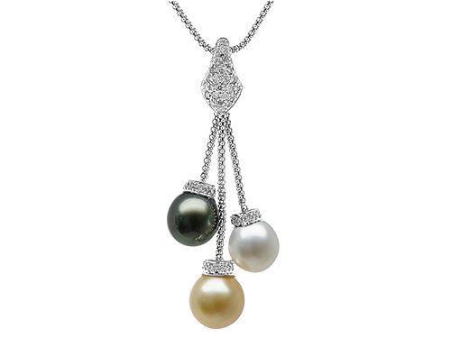 This beautiful pendant features three 10-11mm Tahitian, South Sea, and Golden South Sea pearls. With its 48 diamonds, weighing 0.62 carat. This 18k white gold pendant is a perfect gift for any occasion. Free 16 Inches chain included! FREE GIFT BAG AND GIFT CARD! Finejewelers Style Number: P002139.